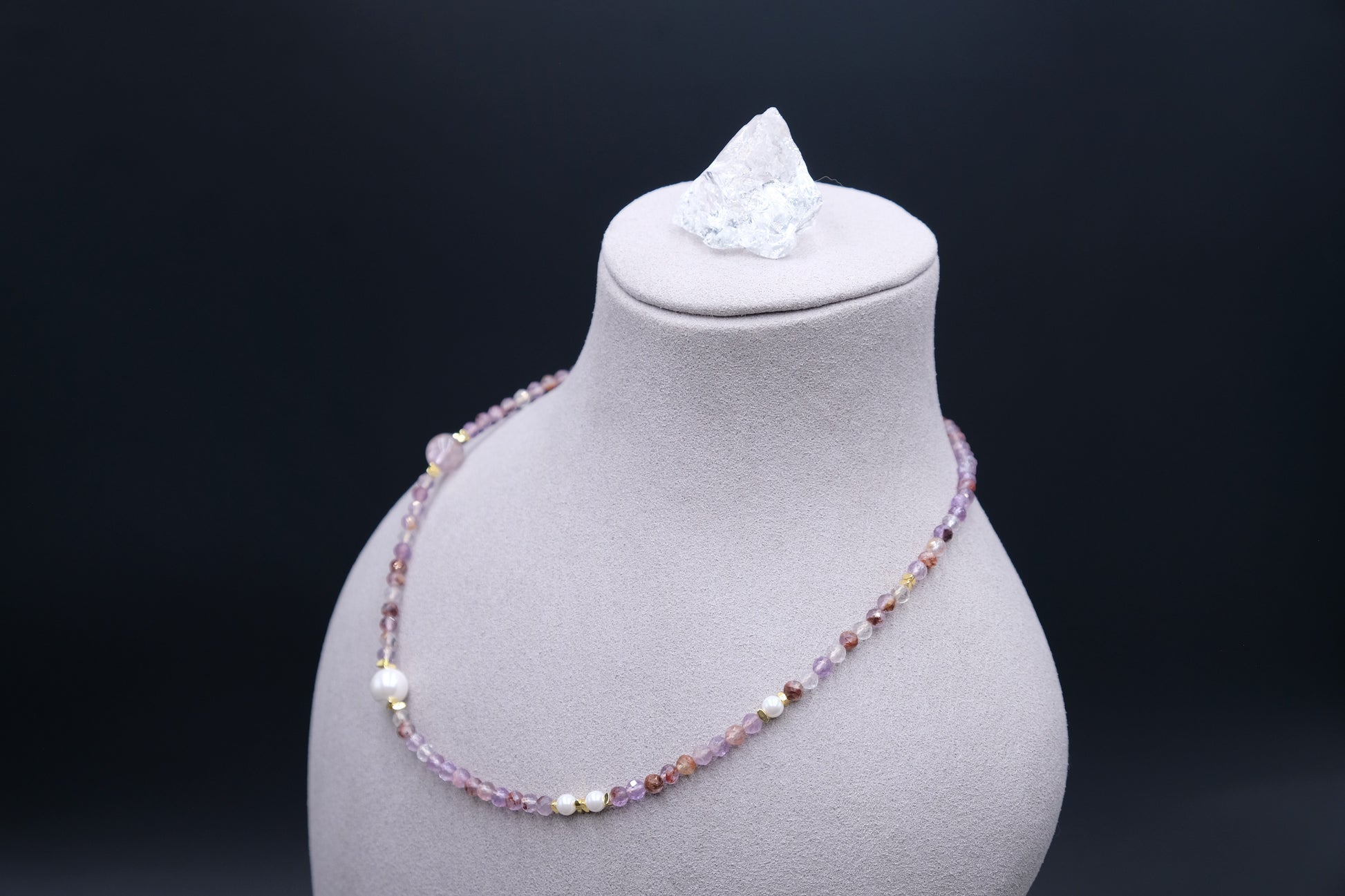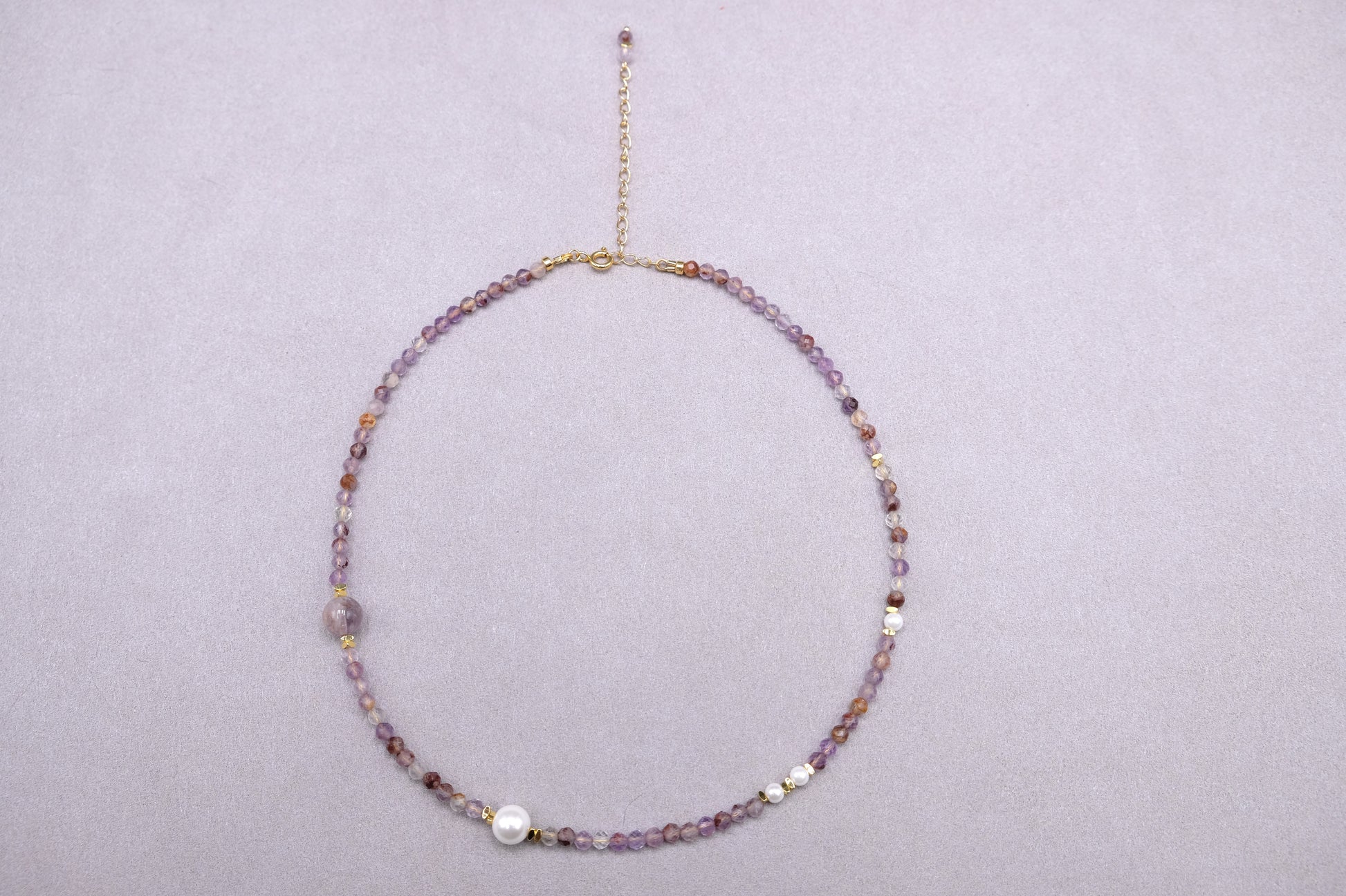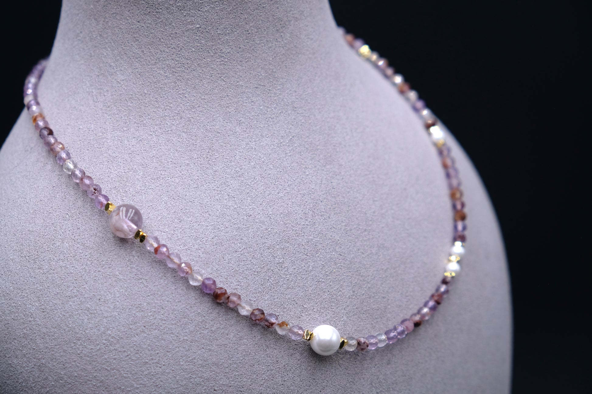 This extraordinary necklace celebrates the woman who embraces her mysterious complexity with grace. Rare phantom amethyst beads carry ethereal inclusions like captured dreams, each one a unique universe of ghostly veils and mystical formations. The luminous white accents dance throughout like moonbeams, creating a symphony of hidden beauty waiting to be discovered.