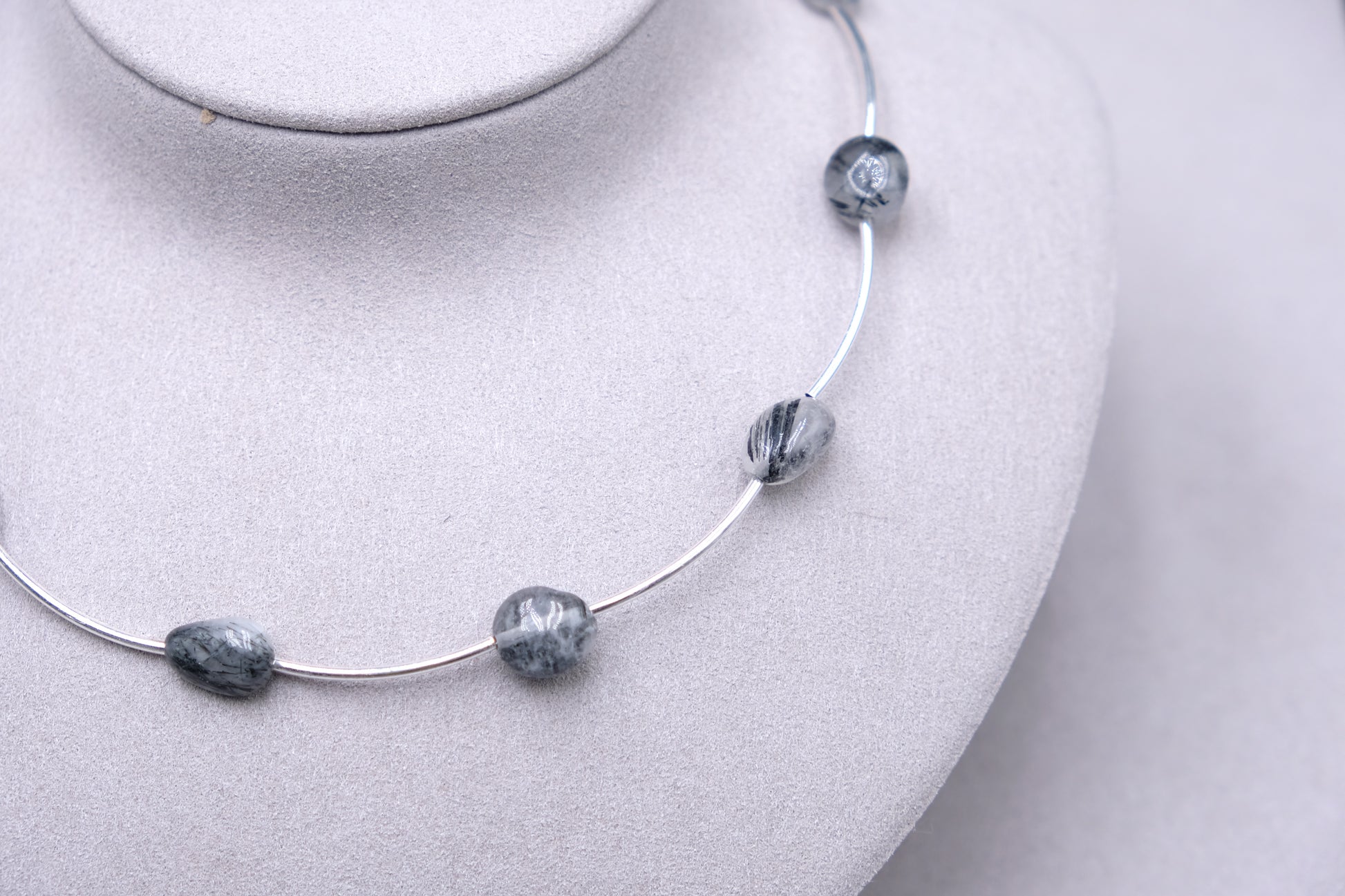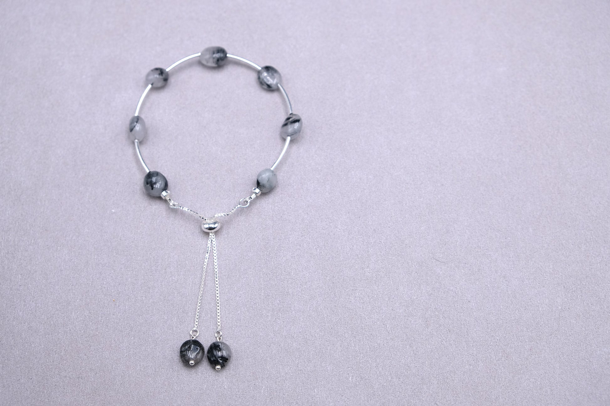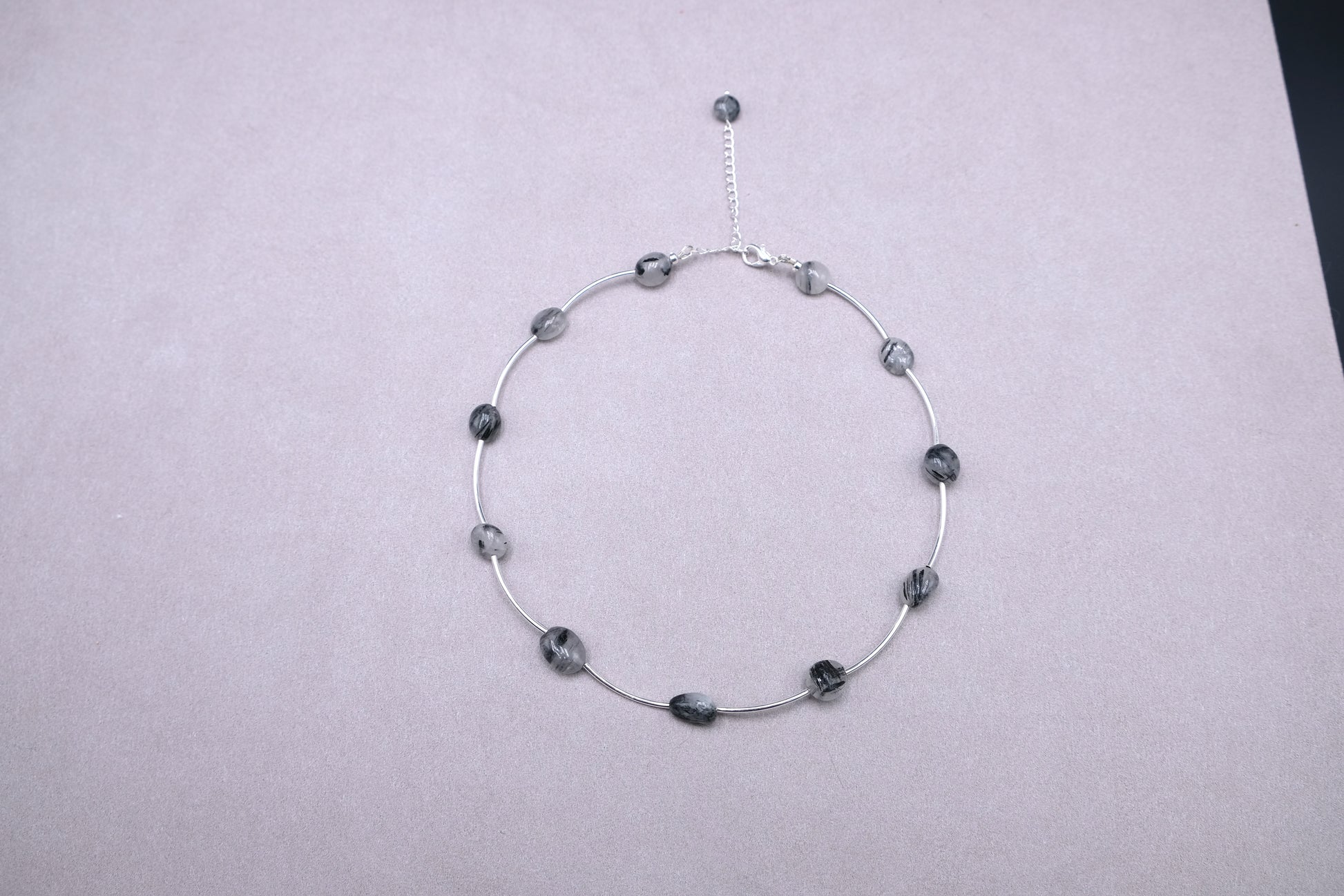 The design embraces minimalism: sleek silver arcs alternate with the dark luster of rutilated quartz, allowing the stone’s natural texture to take center stage. Every bead becomes a fragment of the night, mysterious yet grounding, a reminder that power doesn’t need to shout — it only needs to be.